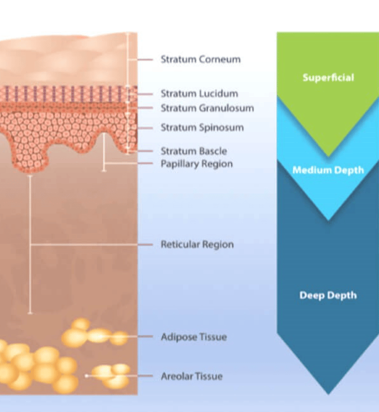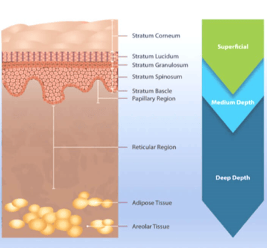 Medium depth chemical peels target more pronounced issues like pigmentation irregularities (PIH) from sun damage, more moderate signs of aging, deeper wrinkles, and promote skin renewal and improved overall texture including reduction of acne scars.With these peels, deeper penetration into the skin occurs, reaching the upper portion of the dermis, (compared to superficial peels that affect the epidermis).